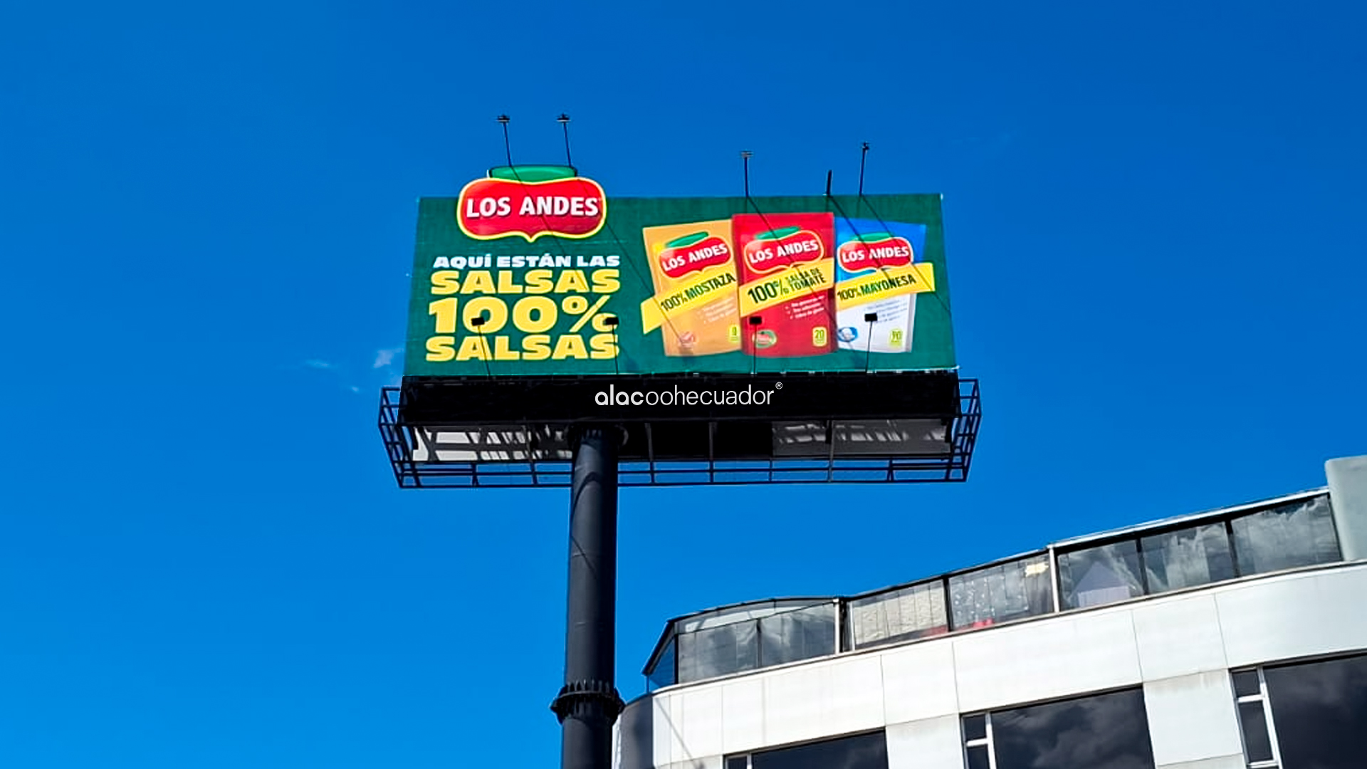 En Alac OohEcuador desarrollamos una nueva instalación para Los Andes, marca reconocida en el mercado de salsas, presentando su mensaje “Aquí están las salsas 100% salsas” con sus variedades de mostaza, mayonesa y salsa de tomate.